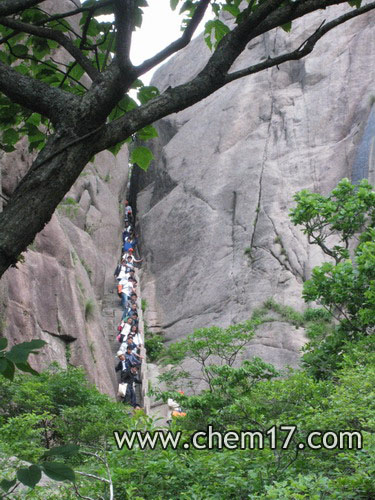 快到百步云梯時,突然發現前行的道路擁堵起來,這在六月的淡季可不多見。原來景區接待了一個大團,熙熙攘攘的人流全擠在一塊了,一路上變得躁動不安。百步云梯,順著上去就可以上蓮花峰,但是坡度極陡,有詩云:“云梯百步客心驚,曲折婉蜒接太清。莫說自然多險境,人生道路更艱辛?!彪m然路程很短,爬上去卻已氣喘吁吁。