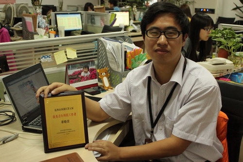 繼羅君、老王之后,產(chǎn)品中心的董曉貴也榮獲“西湖區(qū)優(yōu)秀青年科技工作者”這一殊榮,曉貴是貴州遵義人,早前來(lái)杭州打拼,09年5月份來(lái)到明通的,他戴著一副大框眼睛,外表看起來(lái)有點(diǎn)像剛大學(xué)畢業(yè)似的,笑起來(lái)也比較年輕的感覺(jué),其實(shí)他已經(jīng)是孩子他爸了。