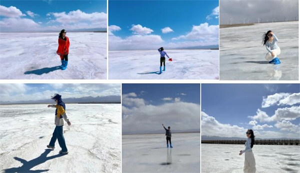 絲綢般輕柔的水面,浸潤(rùn)著潔白的鹽層,風(fēng)吹過(guò),波光粼粼,如煙如霧。漫步于擁有“中國(guó)天空之鏡”之稱的茶卡鹽湖,好似身處蒼穹,不知道踩著的是湖水中潔白的鹽,還是天空上潔白的云。
