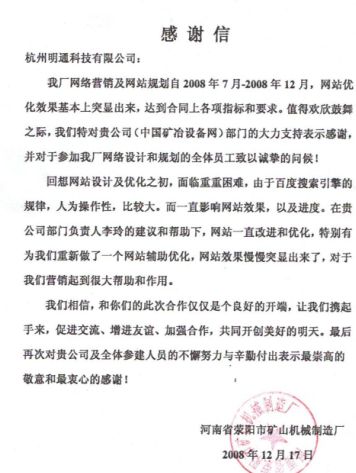 河南滎陽(yáng)礦山機(jī)械制造廠(chǎng)享有中國(guó)礦冶設(shè)備網(wǎng)的網(wǎng)絡(luò)推廣服務(wù)后,網(wǎng)站優(yōu)化效果突顯,促進(jìn)企業(yè)銷(xiāo)售業(yè)績(jī)的快速增長(zhǎng)。滎陽(yáng)礦山機(jī)械特致信對(duì)中國(guó)礦冶設(shè)備網(wǎng)表達(dá)了感謝之意。