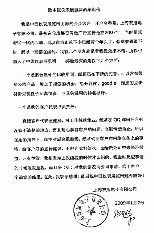 近2年的網絡營銷和網絡推廣給雙旭在市場營銷上產生了良好的推動作用。中國儀表展覽網的優質服務和實效推廣更吸引了雙旭合作伙伴的關注,他們紛紛投入這個專業的行業平臺,宣傳產品,宣傳企業,宣傳品牌,成為為儀表企業雙贏合作的權威平臺。在這樣的專業網絡平臺上宣傳,自然能準確抓住有效客戶,事半功倍!