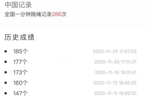 本次跳繩活動中,因為可以不限次數進行跳繩,我們也看到不少小伙伴反復練習、多次嘗試。比如來自安防展覽網的漆金就在11月11日到25日期間跳了五次,成績也是不斷地“更上一層樓”,從最初的147個跳到了最后的185個。